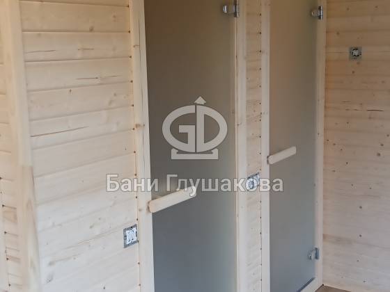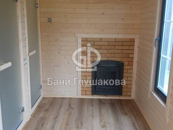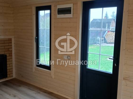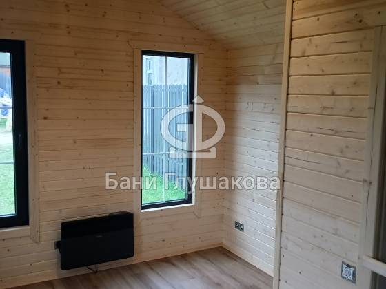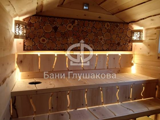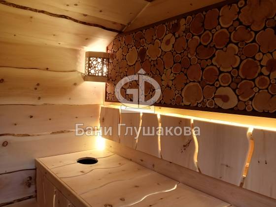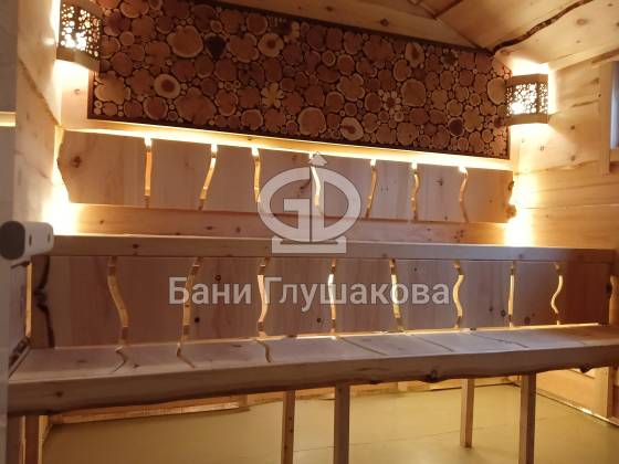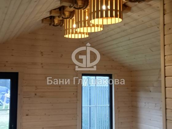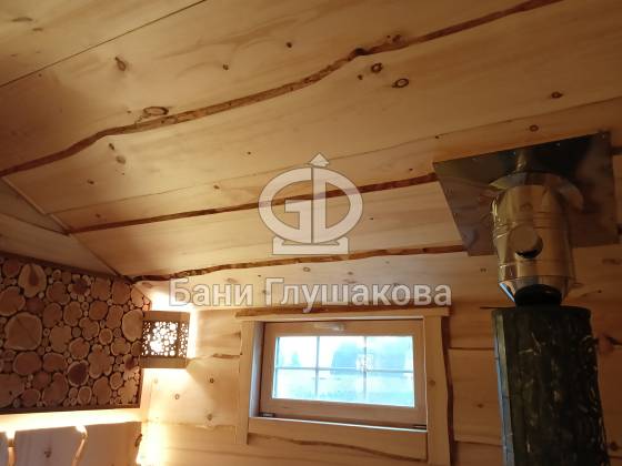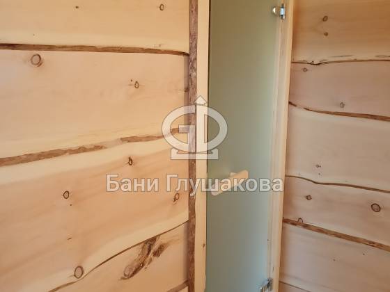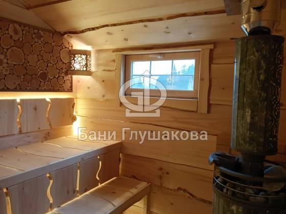 Баня «Барнхаус» с отделкой необрезной доской внутри