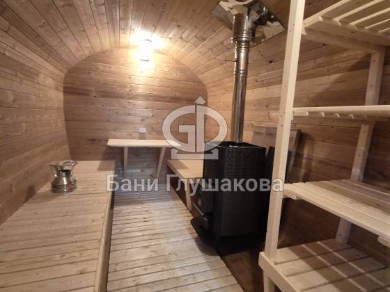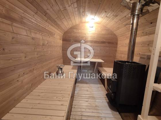 Конструкция выполнена из прочных и долговечных материалов, обеспечивающих тепло и защиту от влаги. За счёт округлой формы, характерной для бани-бочки, помещение выглядит аккуратно и современно, а внутри сохраняется уют и комфорт.