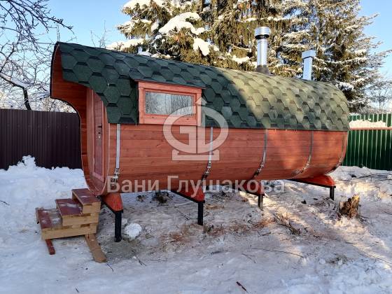 Комплектация: Баня установлена на надежный свайный фундамент, оснащена печью с баком для воды и полностью готова к эксплуатации сразу после монтажа.