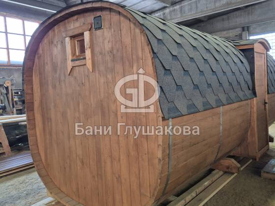 Квадратное сечение (квадро) дает заметно больше внутреннего объема и высоты потолков по сравнению с классическим кругом, поэтому внутри дышится легко и места хватает всем. Баня уже укомплектована фирменной печью, баком для воды и удобными полками — всё готово к первой протопке сразу после установки на участке.