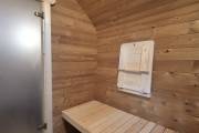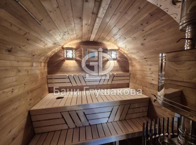 Размер — 2,4 × 4 метра, внутри — два продуманных помещения: комната отдыха и парная. Всё, как нужно, без лишнего.