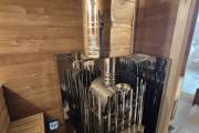 Баня сделана из отсортированной термодоски — мы отобрали хорошее дерево, но с небольшими косметическими изъянами. Ничего критичного, просто живой материал с характером.