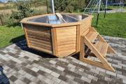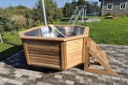 Большой надёжный чан для купания из нержавеющей стали восьмиугольной формы. Благодаря широким стенам и регулирующимся по высоте скамейкам обеспечивается особый комфорт при купании. Края сидений аккуратно закруглены во избежании неприятных ощущений.