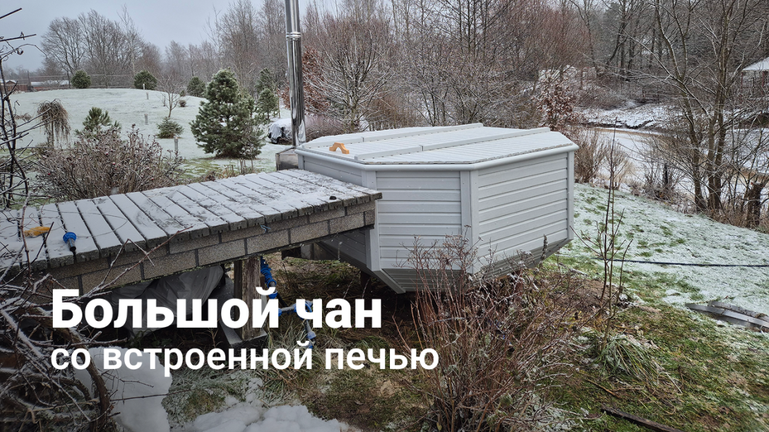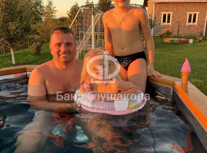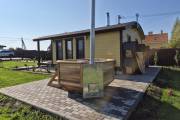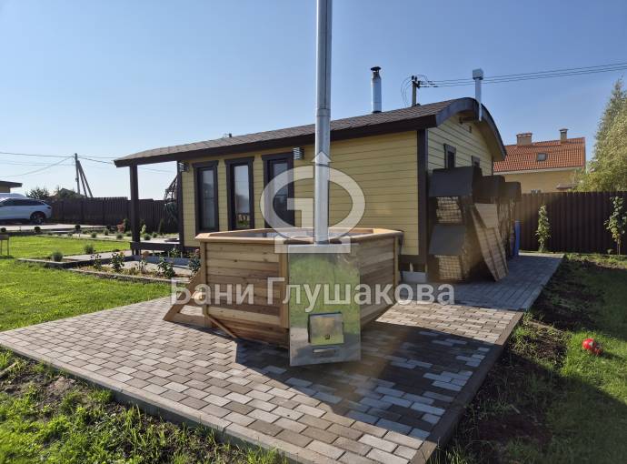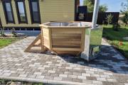 Снаружи купель обшита термомодифицированной вагонкой, которой не страшны сырость и палящее солнце. Материал по свойствам напоминает пластик.