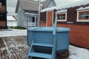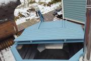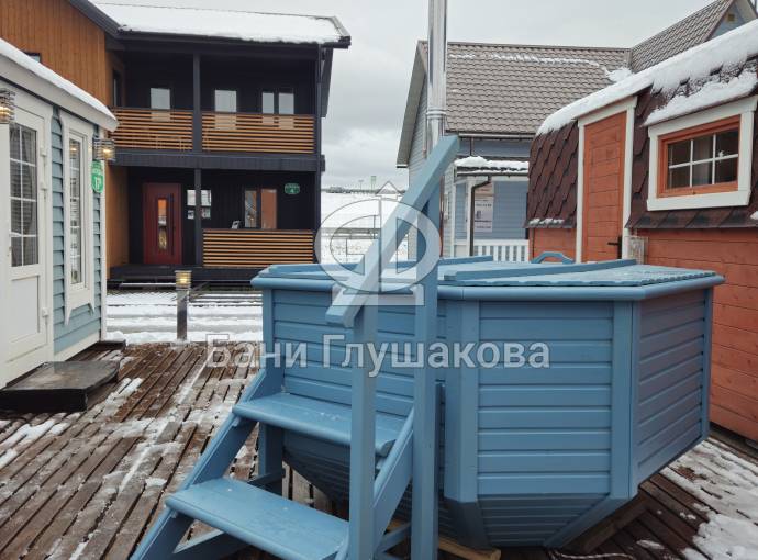 Снаружи купель обшита термомодифицированной вагонкой, которой не страшны сырость и палящее солнце. Материал по свойствам напоминает пластик.