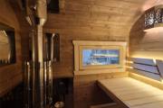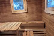 3. Большая парная: «Сердце» бани. Здесь установлена мощная печь ГИД 4, которая быстро прогревает помещение до нужной температуры и обеспечивает густой, качественный пар. Парная укомплектована удобными полками, позволяющими комфортно разместиться нескольким людям.