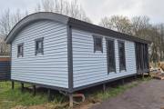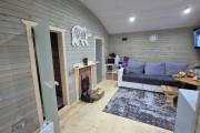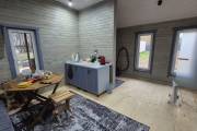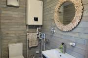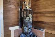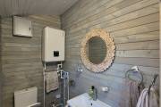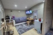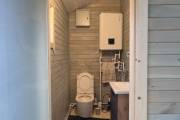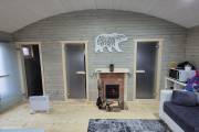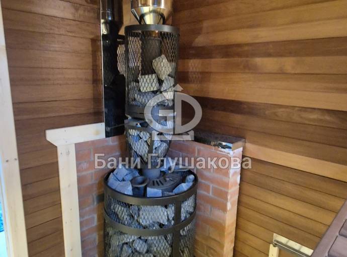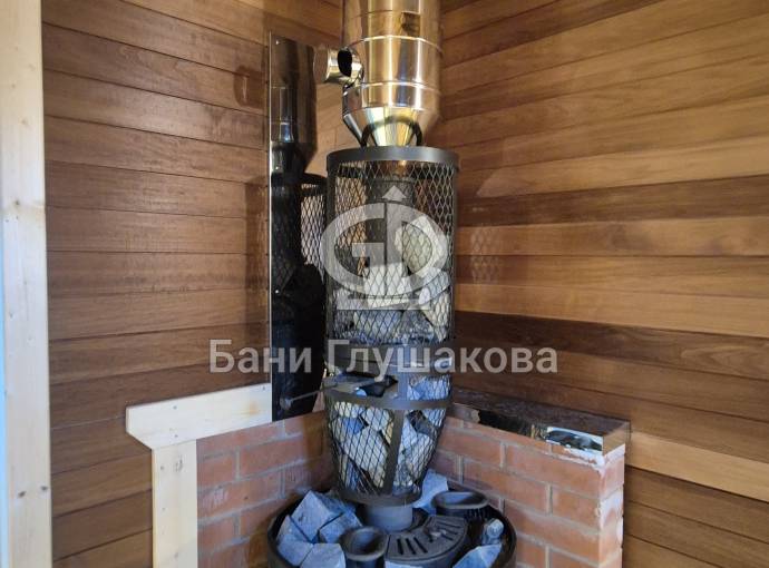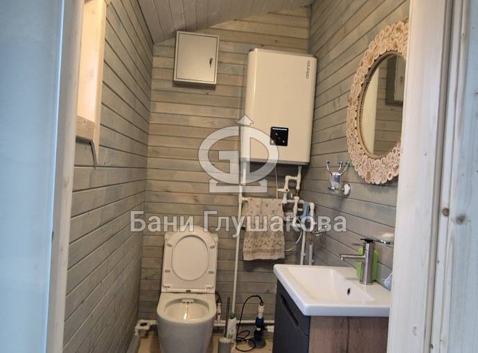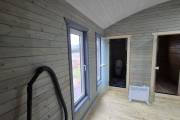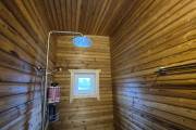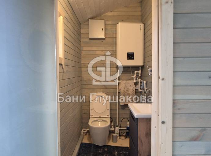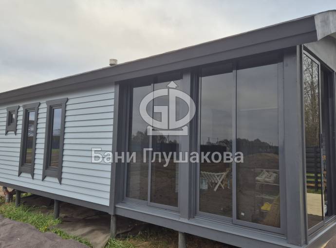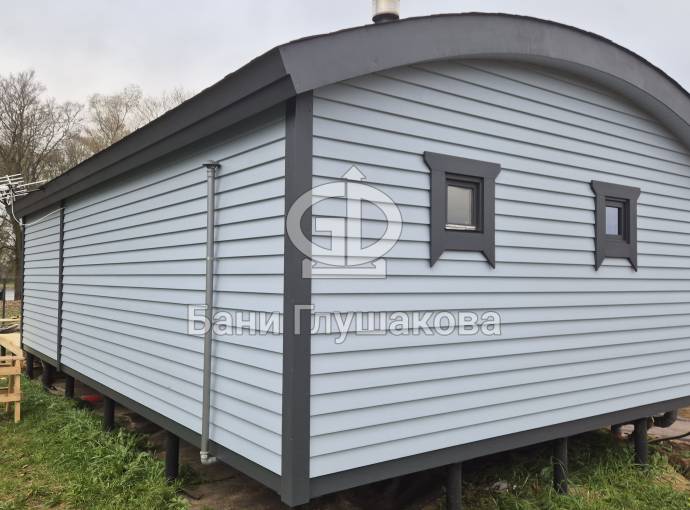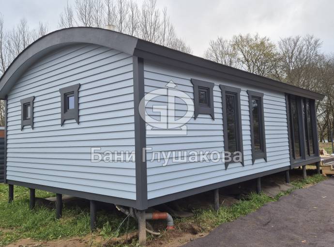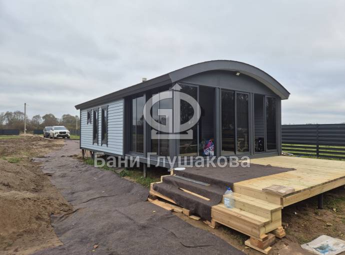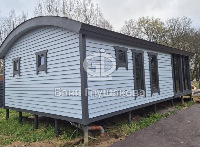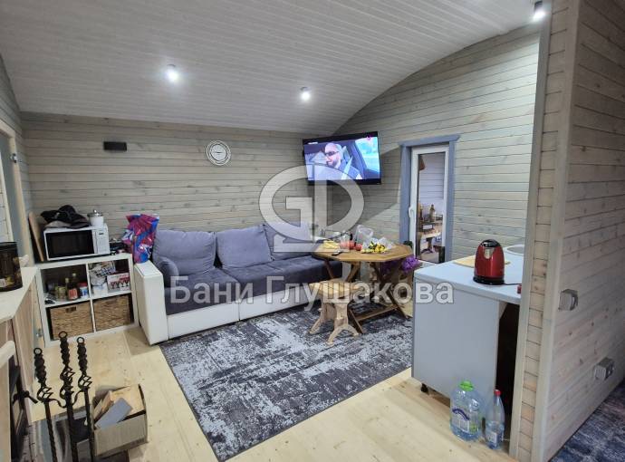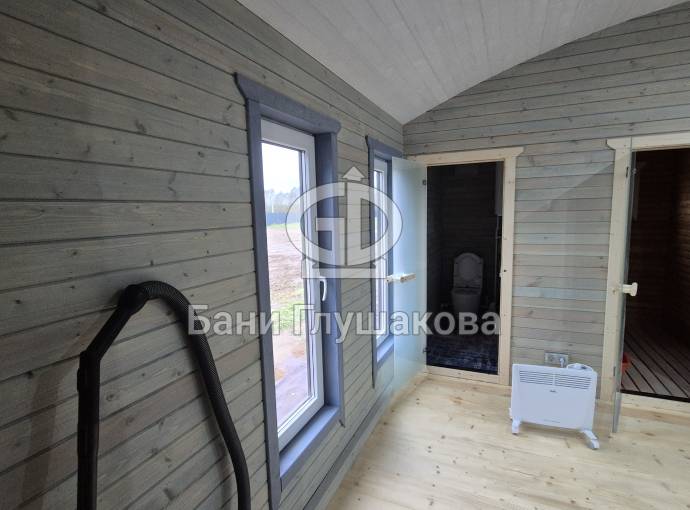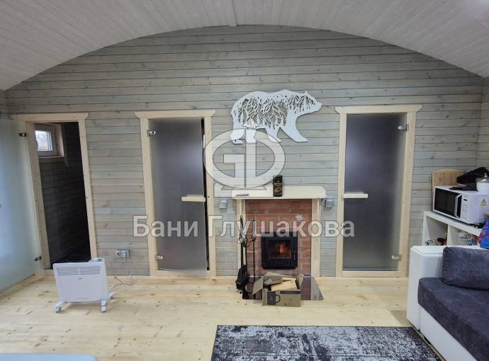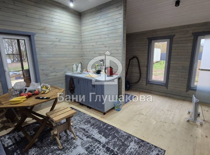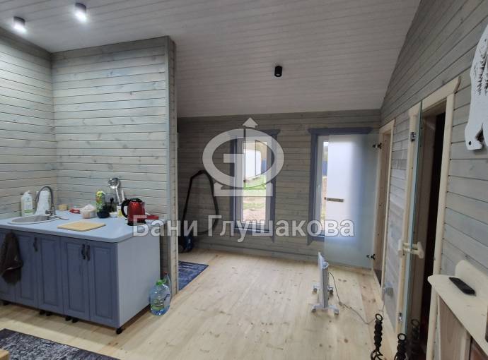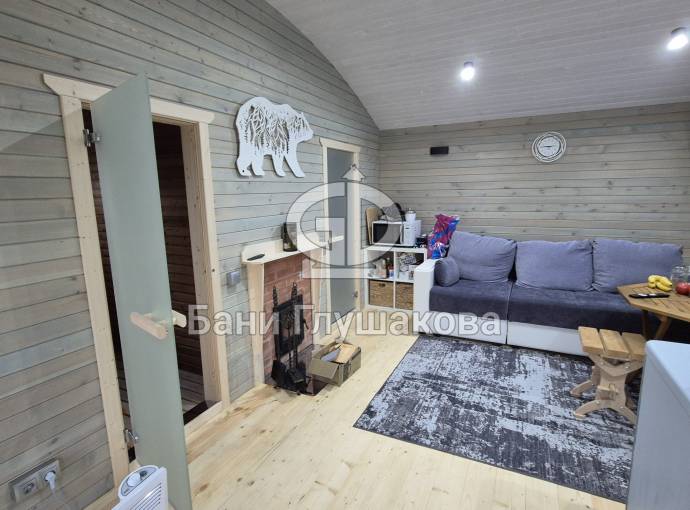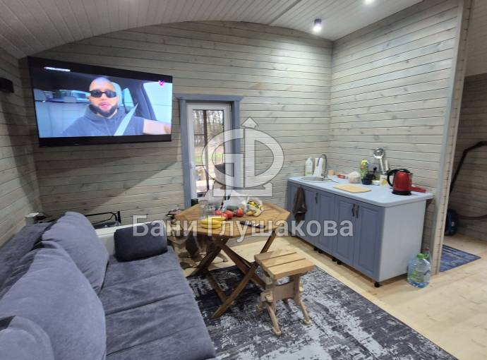 Внутри — всё, что нужно для комфортного отдыха: жилая комната с кухонным уголком, парная, душевая и санузел. Каждая зона продумана до мелочей, чтобы баня стала не просто местом для парения, а полноценным домом выходного дня.