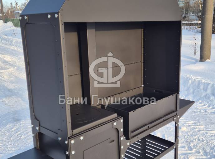 Вытяжной зонт (крыша): Массивный купол не только защищает зону готовки от осадков, но и эффективно отводит дым. Ваша одежда и гости на террасе будут защищены от гари.